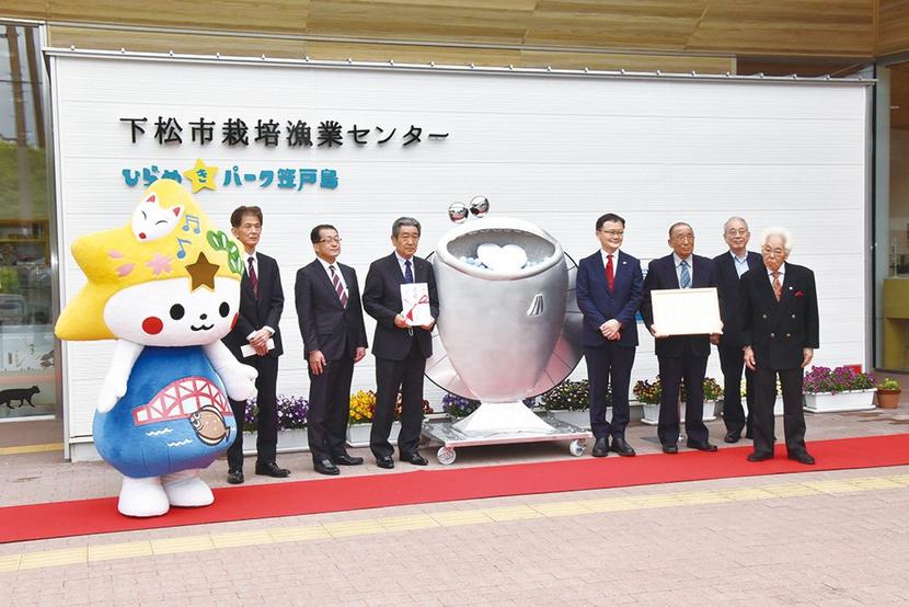 式典で山下社長は「センターのシンボルとして長く使ってほしい」と述べ、国井市長は「山下工業所は下松市のものづくりの先駆者。ものづくりのまちを先導してほしい」と期待していた。