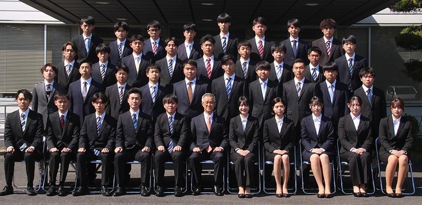 田辺社長と記念撮影する新入社員