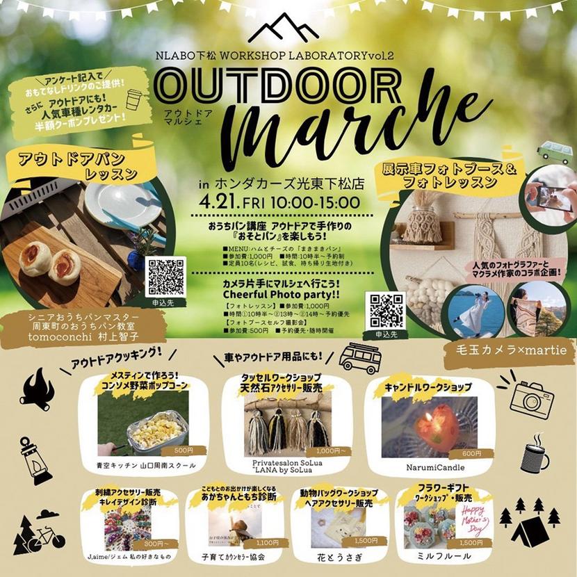 山口県下松市潮音町のホンダカーズ光東下松店で21日(金)午前10時から午後3時まで、おでかけが楽しくなる体験型ワークショップマルシェ「OUTDOORmarch...