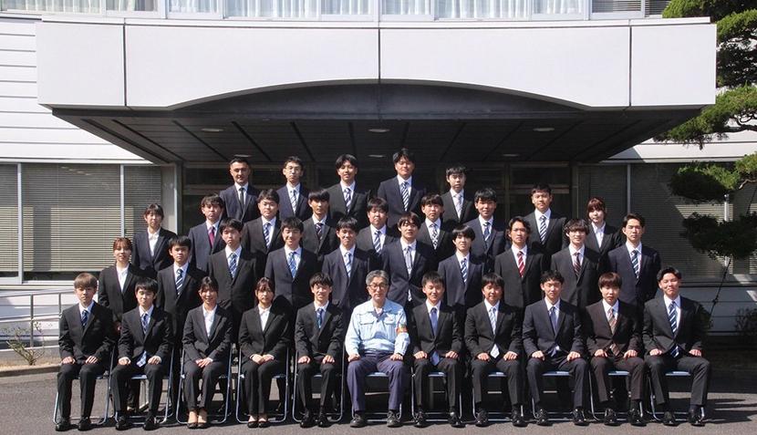 荒瀬事業所長と記念撮影する新入社員