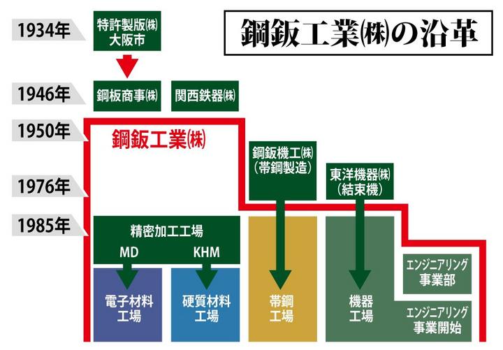 鋼鈑工業は大阪で1934年に創業した「特許製鈑㈱」が前身。37年に東洋鋼鈑が特許製鈑の株式を取得したことでつながり、50年に現在の社名になった。65年に大阪から東京へ、83年に下松市へ本社を移した。