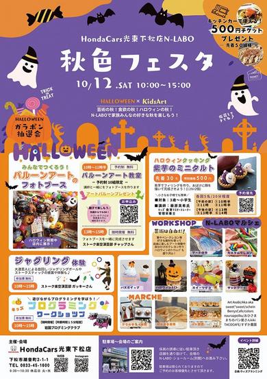 下松市のHondaCars光東下松店N-LABOで12日(土)午前10時から午後3時までHALLOWEEN×kidsArt秋色フェスタが開かれる。秋の開催は今...