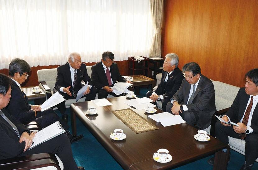 国井市長(左手前)に要望内容を説明する弘中会頭(右端)