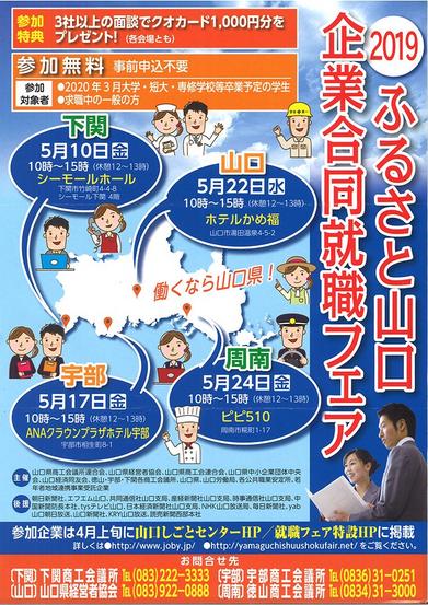 2019ふるさと山口企業合同就職フェアが24日午前10時から周南市糀町のピピ510で開かれる。来春、大学、短大、専門学校などを卒業する学生だけでなく、一般の求...