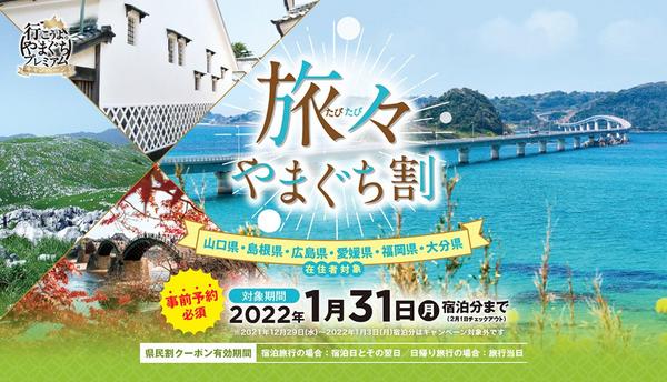 県内の登録旅行会社、宿泊施設などからの予約で、最大5千円の宿泊・日帰り旅行割引と、最大2千円分の買い物クーポン券のサービスが受けられる「旅々やまぐち県民割」が...