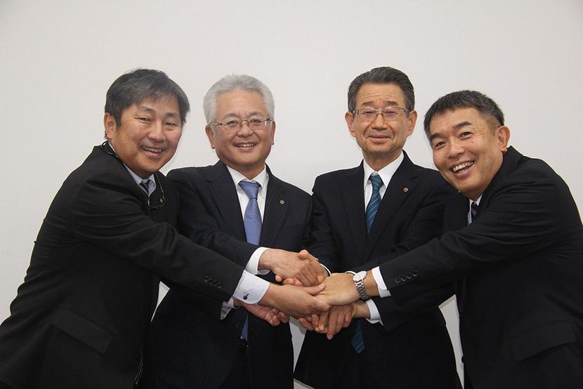 座談会で握手する左から原田、弘中、東、赤坂各会頭