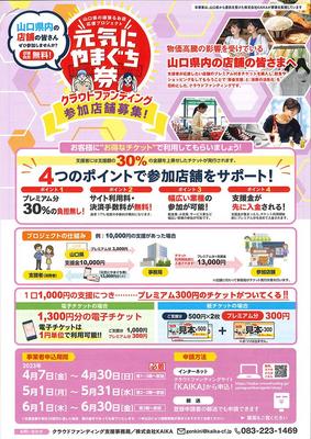 参加店舗を支援する人に、その店で使える30%のプレミアム付チケット「元気にやまぐち券」を山口県がプレミアム分の費用を負担して発行する購入型クラウドファンディン...