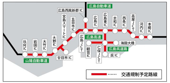 [高速道路]山陽自動車道の規制予定区域は玖珂インターから広島県三原市の本郷インターの間で、国道2号、中国自動車道がう回路になる。ただし、国道2号は広島市中心部で交通規制がある。
