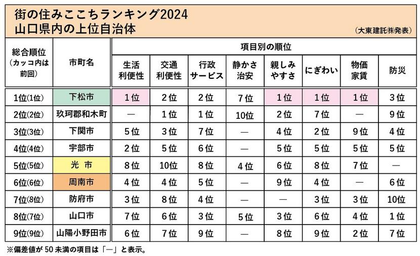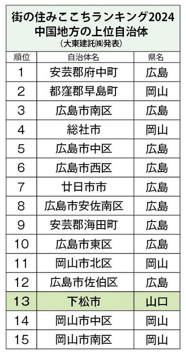 経済その他賃貸住宅大手の大東建託㈱の「街の住みここち&住みたい街ランキング2024」で、山口県下松市が5年連続で県内1位になった。5位の光市▽6位の周南市も、前年度と同順位を維持した。