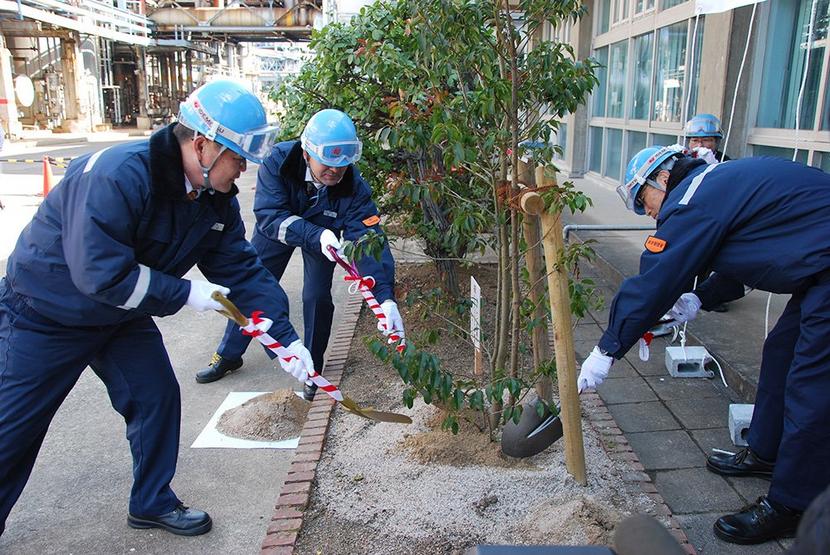 ソヨゴを植樹する八山所長ら