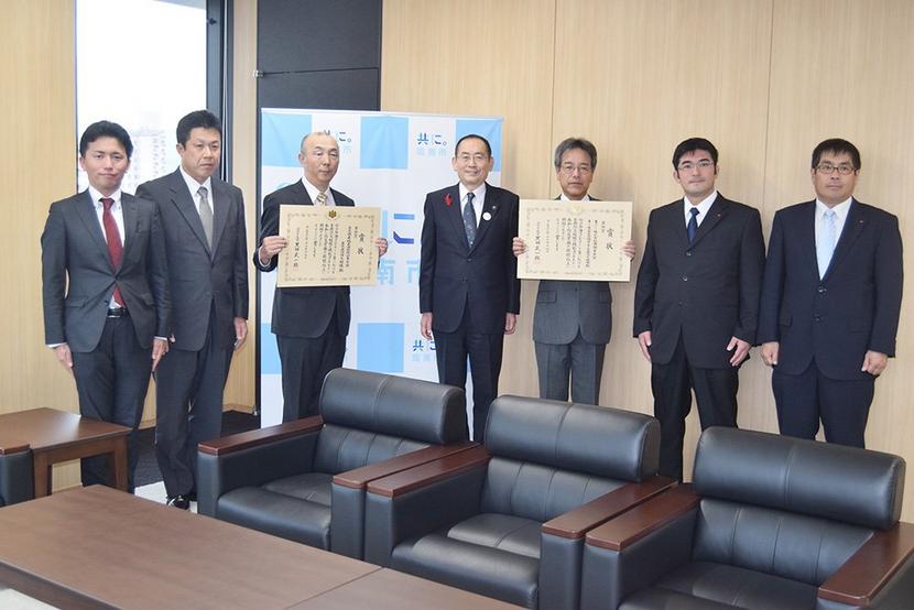 左から奥原、弥益、橋本さん、市長、広長、原田、中山さん