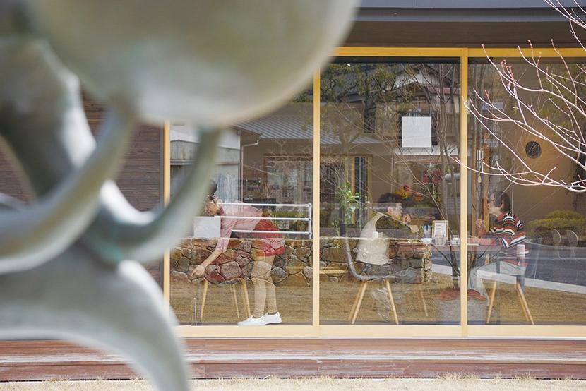 庭のオブジェ越しに見えるカフェ