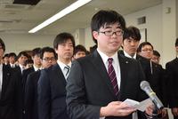 田代所長(手前)に決意表明する深町さん