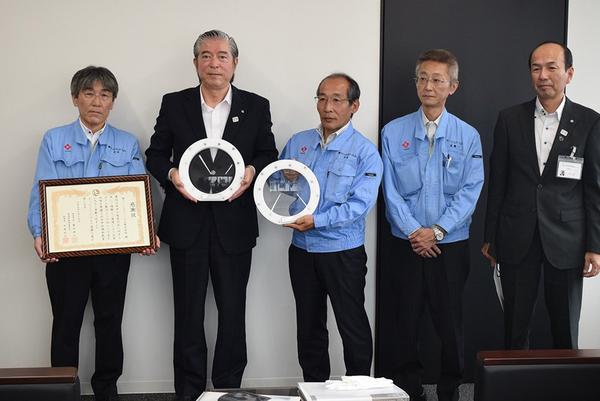 日本ゼオンは13日、周南市役所新庁舎の完成記念としてソニー製の4K液晶テレビ(65インチ)を市に贈った。 同社徳山工場の渡辺誠工場長(56)と増田修二・人...