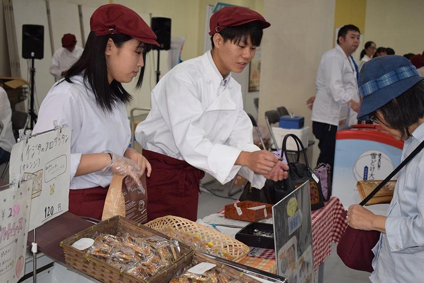 周南市の徳山商工高、熊毛北高の生徒が地元の店の協力で開発に携わった焼き菓子やパンなど販売する「特産品も売っちょるよフェア」が8日、イオンタウン周南で開かれ、両...