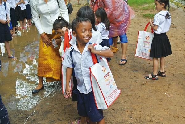カンボジアの小学生に文具 元ロータリー奨学生も訪問