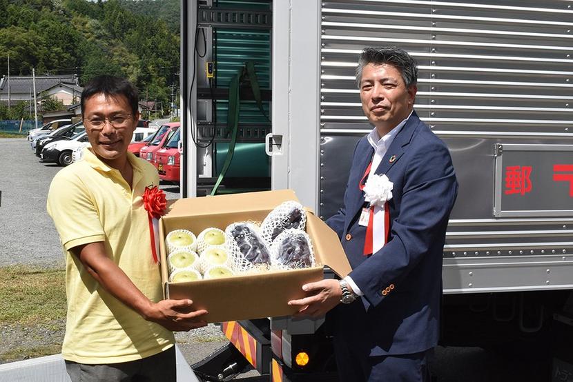 周南市の徳山郵便局から全国へ「ゆうパック」で届けられる須金地区のブドウ、ナシの出荷式が9日、ふれあいプラザ須金で開かれ、ナシ、ブドウを積みこんだトラックが出発...
