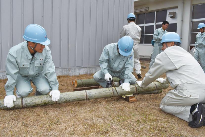 作業は繁永さんと同社経営企画本部経営企画グループの岩井正生主席、中村孝士担当主席らが指導。のこぎりを使う機会がほとんどない部員もいたが、助け合って次々に竹をカット。2年の村川天音主将は「僕たちが切ったものが駅で使われ、いい気分です」と話していた。