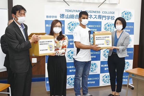 周南市の徳山商工会議所は3日、市内共通商品券1万3千円分ずつを徳山総合ビジネス専門学校の留学生300人、徳山大の164人、徳山高専の2人に贈った。466人分、...