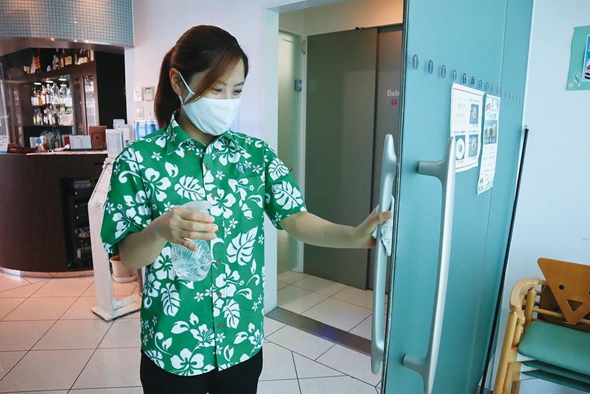 ドアノブを消毒する店員
