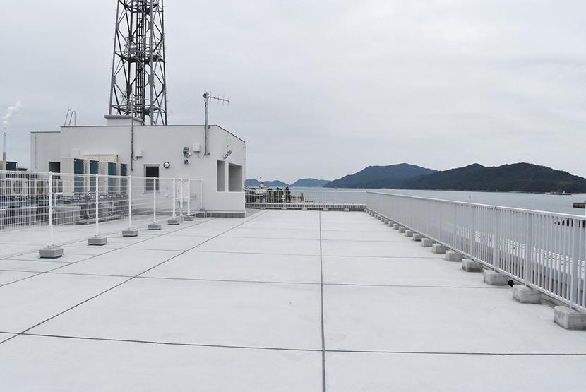 屋上は周南市が整備を要望したという展望デッキ。徳山湾や市街地が一望できる。ただ、ふだんは鍵がかかっていて同事務所の職員が一緒の特別な時でないとデッキに入ることはできない。