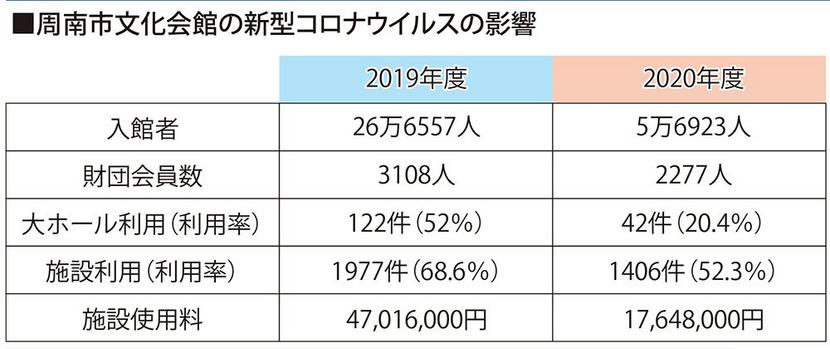 経済周南市周南市文化会館の昨年度の入館者数は新型コロナウイルス感染拡大の影響で5万6,923人と2019年度の2割にとどまったことがわかった。多くのコンサートが中止になり、同館を運営している市文化振興財団の会員数も2,277人で、前年の3,108人から千人近い減少となった。市美術博物館もほとんどの展覧会が中止になり、利用が激減した。