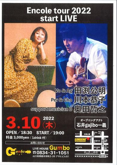50歳を超えてプロデビューを果たした田渕公明さんのギター弾き語りライブ「Encole tour 2022 start LIVE」が10日(木)午後7時から、山...
