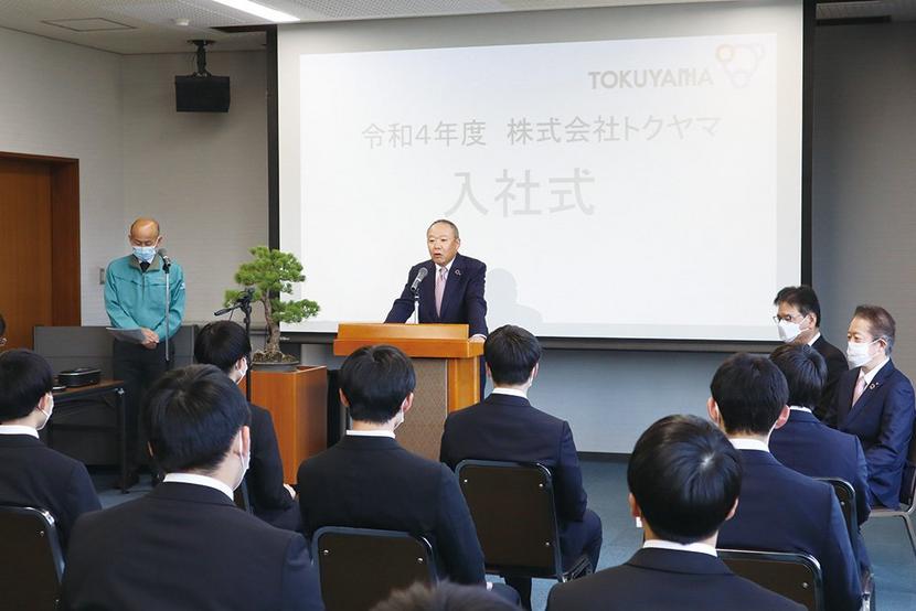 ㈱トクヤマの新入社員入社式が1日、山口県周南市御影町の徳山製造所で開かれた。高卒社員36人が出席し、大卒社員35人と高専卒社員9人は自宅からオンラインで参加し...