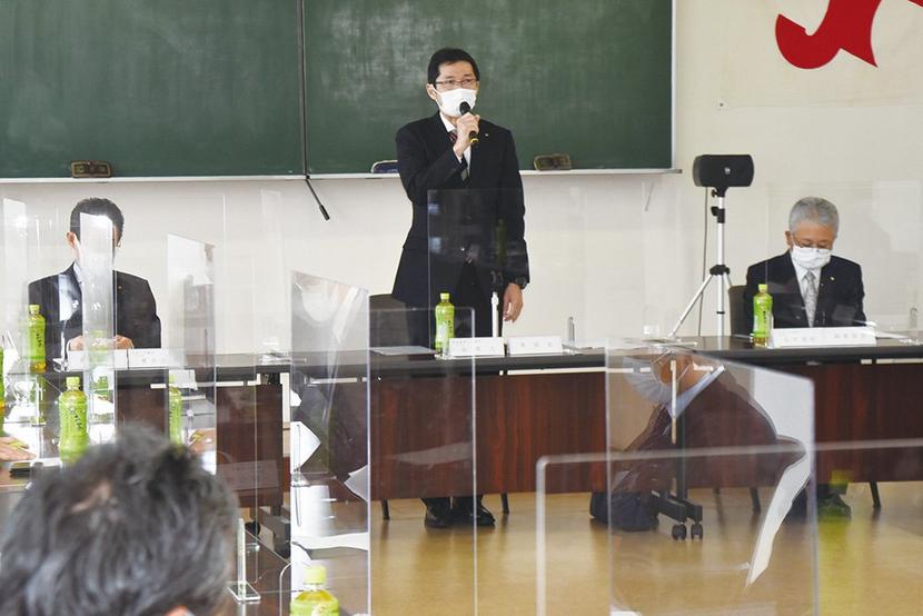 あいさつする谷委員長