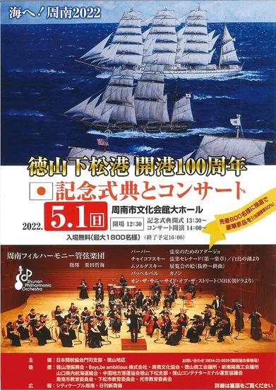 徳山下松港開港100周年記念式典とコンサートが5月1日(日)午後1時半から山口県周南市文化会館大ホールで開かれる。入場無料。来場者の中から抽選で11月に徳山下...