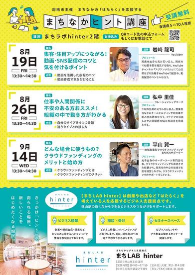 ビジネスや創業、出店を考えている人を応援する山口県周南市銀座2丁目の「まちラボhinter」の2階で徳山商工会議所主催のまちなかヒント講座が26日(金)、9月...