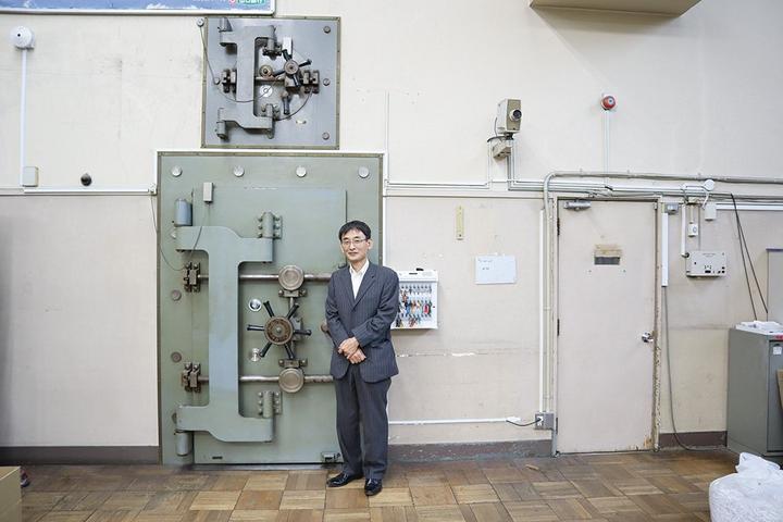 旧支店の金庫の前に立つ山本支店長