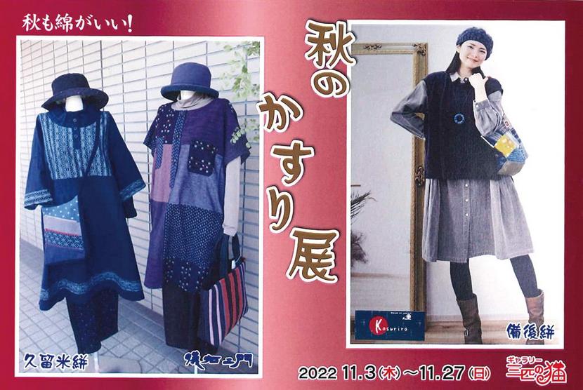 福岡県久留米市の久留米絣の「儀右エ門」と、広島県福山市の備後絣の「カスリラ」による「秋のかすり展」が11月3日(木・祝)から27日(日)まで、山口県周南市新堀...