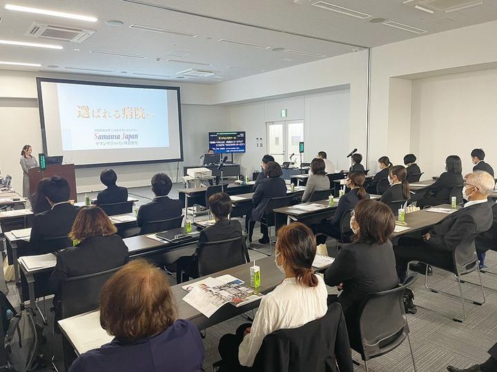 14日のランチョンセミナーでは「医療レベルを上げ、病院のイメージアップにつながる“ホスピタリティサービス”」と題して、同社の中村真由美取締役が動画も織り交ぜながら会を円滑に進行した。来場した80人は昼食をとりながら、業務内容や企業理念、社内の取り組みの一つである親孝行月間など、ホスピタリティの高い同社の理念に聞き入った。