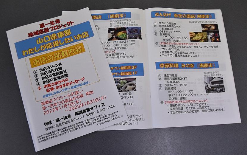 第一生命周南エリアの山口県周南市岐山通の周南営業オフィスは同エリアの岩国市から防府市までの飲食店を紹介する冊子「山口県東部わたしが応援したいお店」を作成した。...