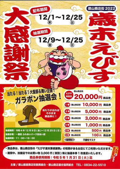 山口県周南市の徳山商店街で、歳末えびす大感謝祭が1日から25日(日)まで開かれている。賞品はえびす特別賞の2万円から6等100円まで、いずれも商品券で、はずれ...