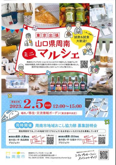 山口県周南市は東京の中央区京橋1丁目1-6越前屋ビル1階の移住・交流情報ガーデンで、2月5日(日)の正午から午後3時まで、初の「東京出張 山口県周南ミニマルシ...