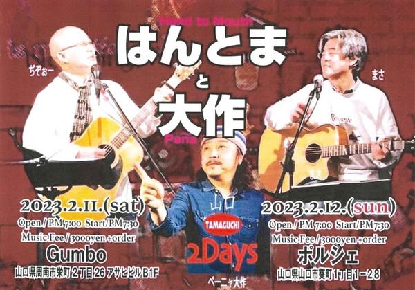 メッセージソングを歌う2人組、Hand to Mouth(はんとま)とペーニャ大作による3人のギター弾きライブ「はんとまと大作」が2月11日(土)午後7時半か...