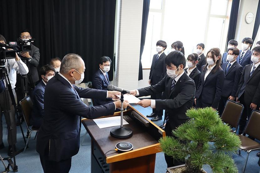 横田社長は訓示で「皆さんと共に、国際性に富み、実学を実践し、人間力の高い、フロンティア精神を持った集団を作っていきたい」と期待を込めた。新入社員を代表して下松工高卒の金子洸希さん(18)が辞令を受け取り、徳島大大学院修了の松岡芹奈さん(24)が「一日でも早く立派な戦力として会社に貢献できる存在になりたい」と宣誓した。
