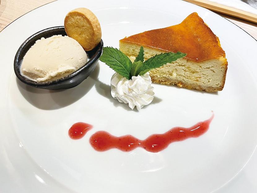 カフェメニューの「自然薯チーズケーキとお好きなドリンク」(950円)は、ジネンジョが入ったチーズケーキには、周南市のジェラテリアクラキチの特製ジネンジョジェラートが添えられる。