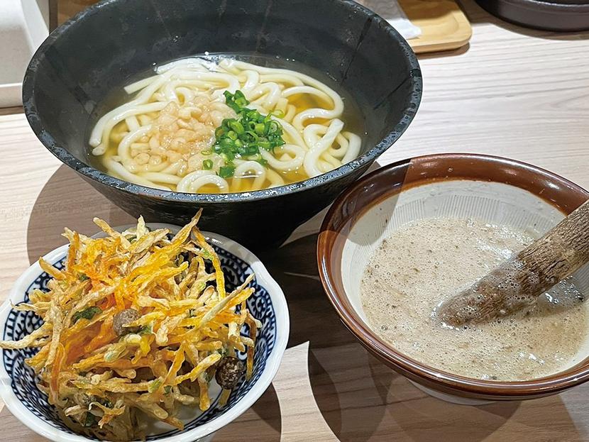 井上社長のおすすめは「自然薯とむかごのかき揚げとろろうどん」(並1,100円)。すり鉢に入ったジネンジョに出汁を加えながら滑らかになるまでする。出汁にこだわったうどんは化学調味料無添加で優しい味わい。その上にジネンジョ、ムカゴ、ゴボウなど5種類の野菜のかき揚げを乗せてジネンジョをかけて食べる。