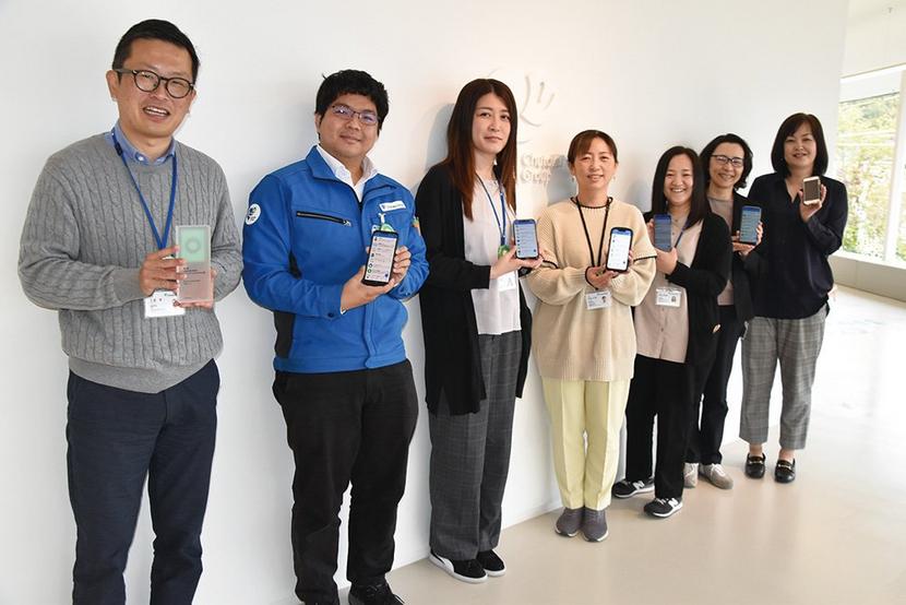 トロフィー、スマートフォンを手に受賞を喜ぶ社員