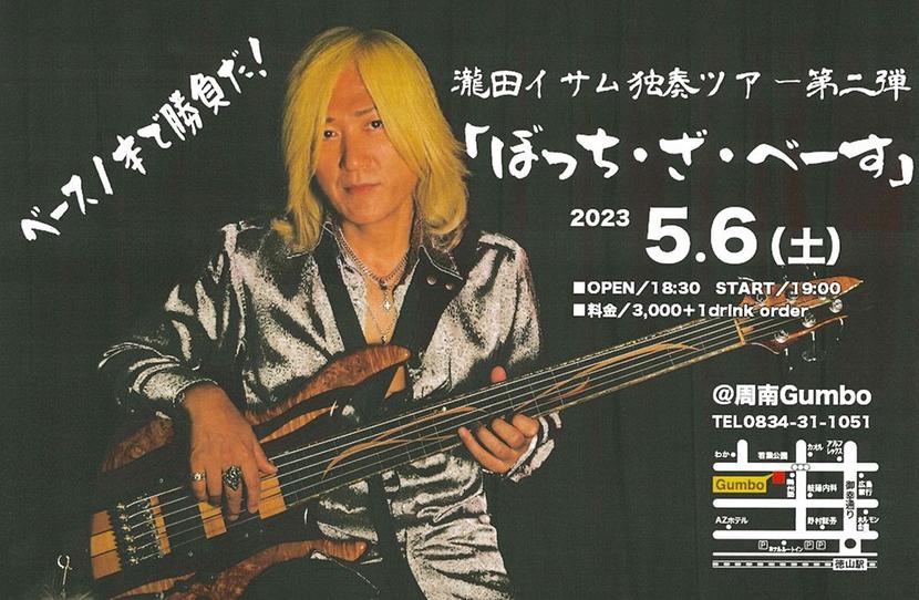六三四Musashi、アーク・ストームなどのバンドでベーシストとして活躍した瀧田イサムさんの単独ライブ「ぼっち・ざ・べーす」が5月6日(土)午後7時から、周南...