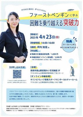 昨年放送されたドラマ「ファーストペンギン!」(日テレ系)の主人公のモデルとなった山口県萩市在住の坪内知佳氏(36)による講演会「ファーストペンギンに学ぶ 困難...