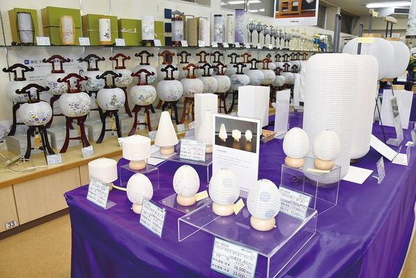 進物の大進で盆提灯の展示会が開かれている。山口県周南市岐南町の徳山店では140点が並び、伝統的な盆提灯、接続部分に磁石(マグネット)が取り付けられている簡単組...