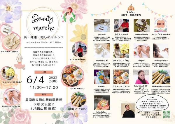 山口県周南市の徳山駅前図書館3階の交流室2で4日(日)午前11時〜午後5時、美・健康・癒しをテーマにした「ビューティーマルシェACT.周南」が開かれる。 主...