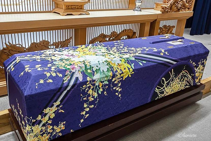 山口県周南市のJA総合葬祭ルミエールが、華道家、假屋崎省吾さんプロデュースの御棺「花筐(はながたみ)」を取り扱っている。 瑠璃色の下地に金色の群雀蘭を描いた...