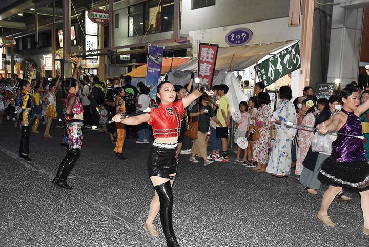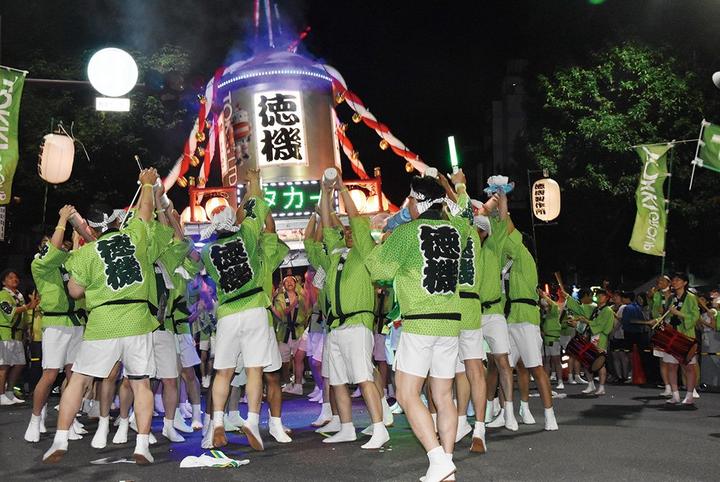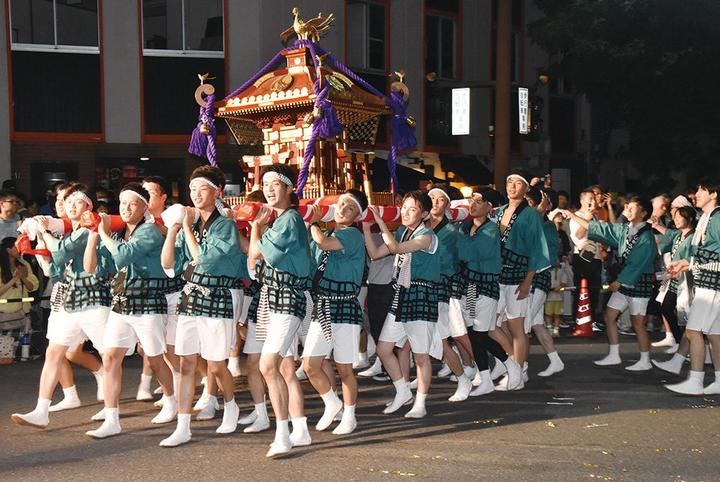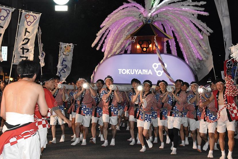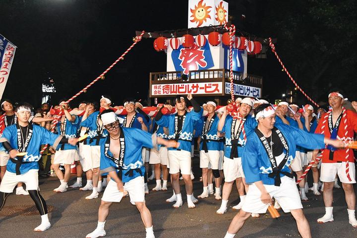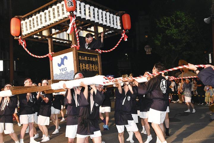 経済周南市周南市の第50回徳山夏まつりが22日夕、徳山駅前の平和通、銀座通を歩行者天国にして開かれ、8万人でにぎわった。コロナ禍などで5年ぶりの再開だったが、以前のにぎわいを取り戻した。企業など12団体が出場したミコシの練り歩きは西京銀行が最高賞の市長賞、出光グループが市議会議長賞、トクヤマが徳山商議所会頭賞だった。