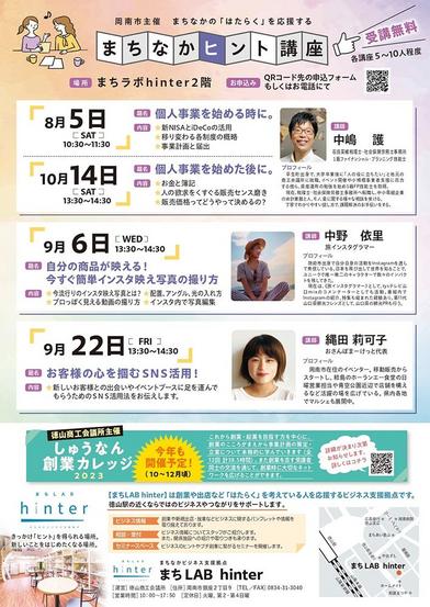各講座とも定員5人から10人程度で参加無料。申し込みや問い合わせはQRコード、またはまちラボhinter(0834-31-3040)まで。