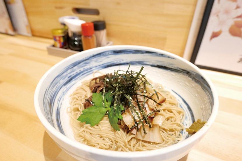 看板メニューの徳山旨塩ふぐまぜそば(800円)の出汁には徳山ふくセンターのふぐを使用。青山町のスタンド製麺に特注した麺は小麦粉にもこだわり、食感を重視した。
